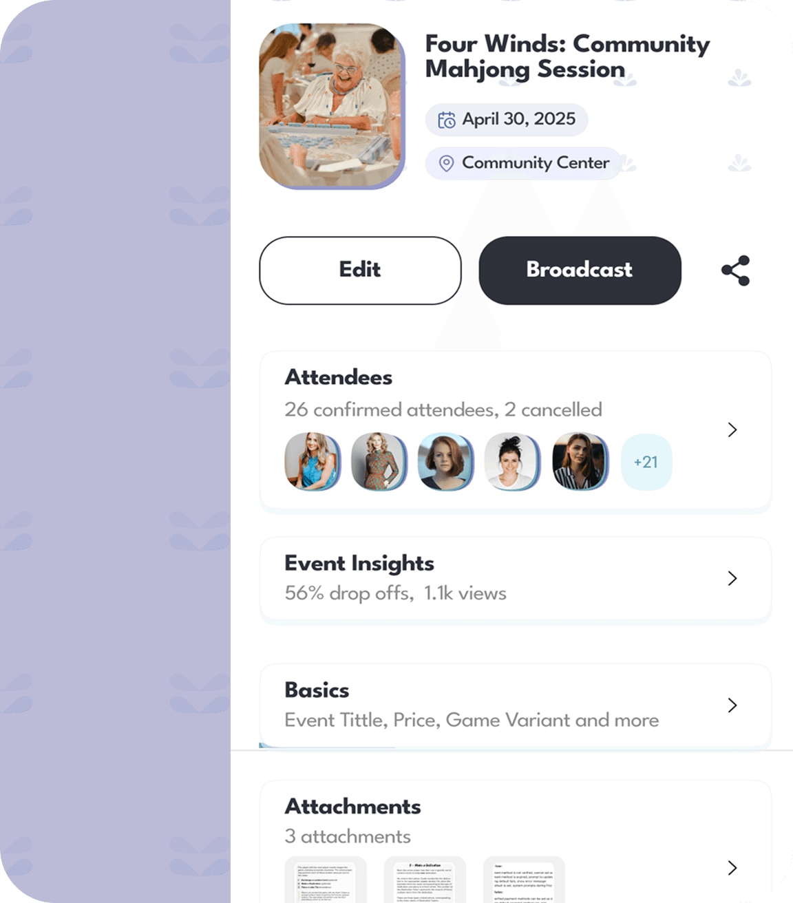 Tiletime brings all your Mahjong games into one place - discover events, RSVP in seconds, manage your games, and stay connected with the community without juggling multiple apps.