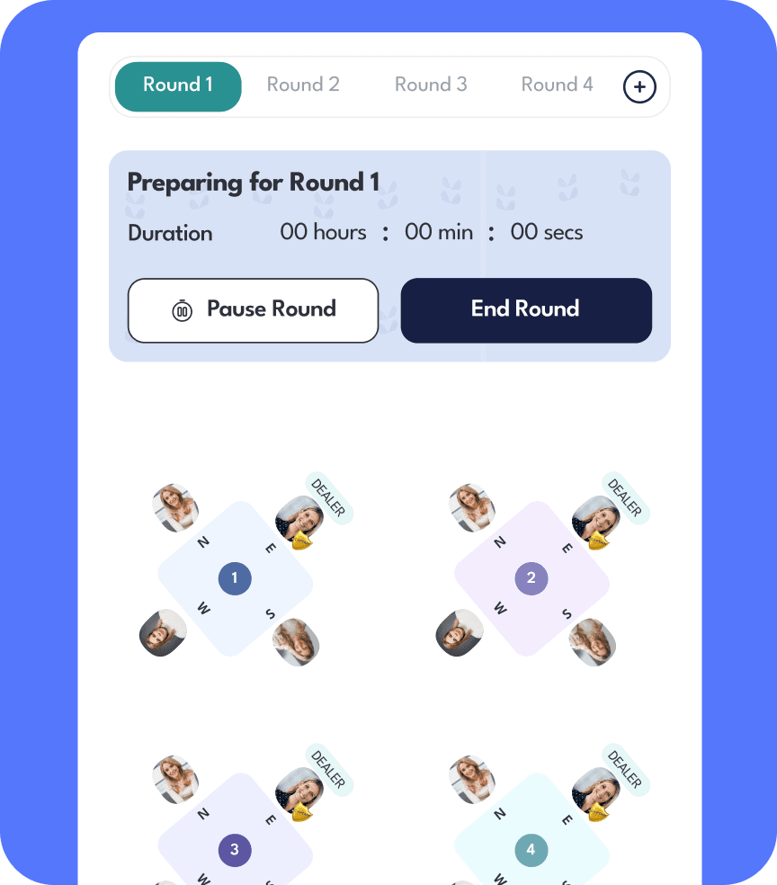 Run games from start to finish — check players in, assign tables and seats, manage rounds, broadcast updates, and maintain a clear leaderboard, all from one place.